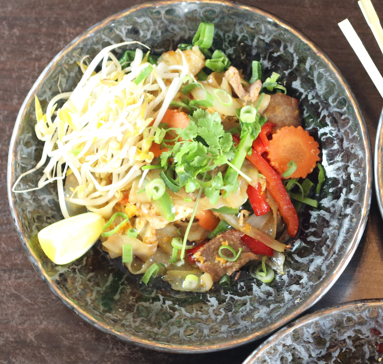Rice noodles wok fry with chicken or veg, egg in our tamarind base sauce, crushed peanuts and bean shoots.