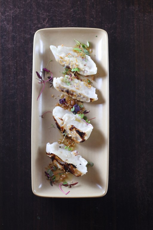 A mixed plate of prawn, scallops, pork, veg and gyoza (2 of each).